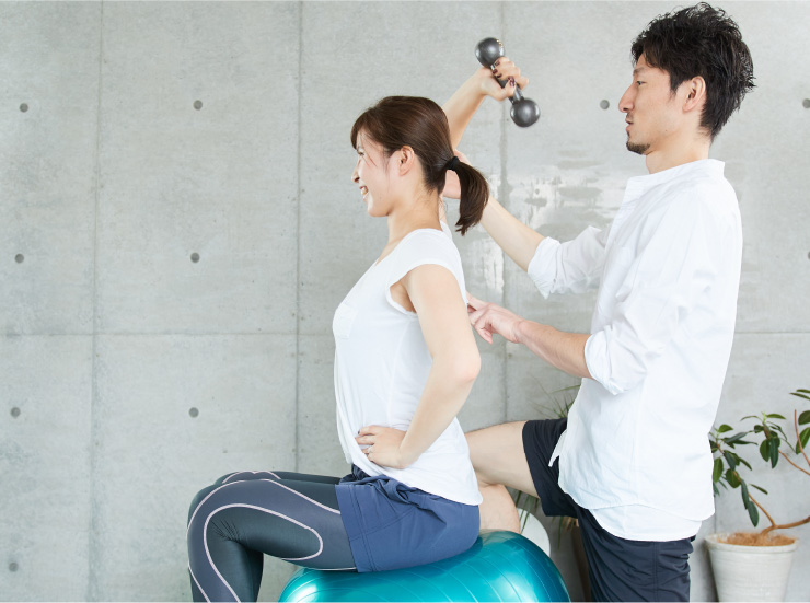 身体の動きの専門的知識をもつ理学療法士が体の動作や姿勢を分析し、医学的根拠に基づくトレーニングを個別に指導する「理学療法士によるパーソナルトレーニング」を行っています。